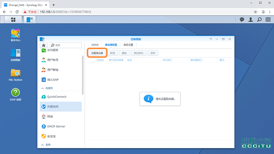 DMZ主机可将内网某台设备(只能设置1台设备)的所有端口都自动映射到公网上。打开DMZ主机设置,添加群晖NAS的内网IP192.168.1.5保存。