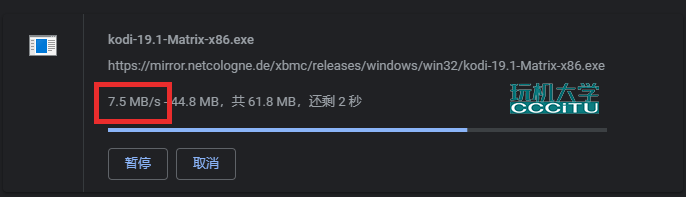 如上图从 KODI 位于德国的官方服务器,下载一份最新KODI安装包,下载速度仅有约30KB/s