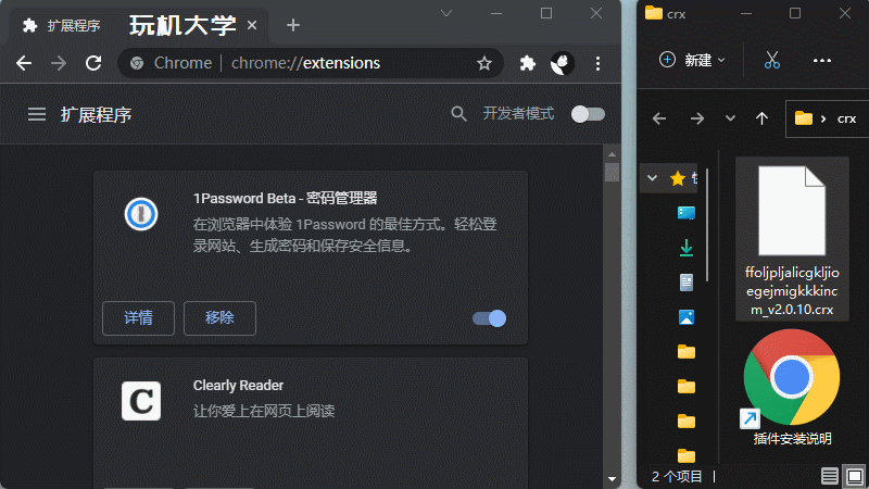 复制 chrome://extensions/ 到谷歌浏览器或 Edge 浏览器的地址栏打开,打开右上角的开发者模式,解压压缩包,将后缀名为 .crx 的文件拖动到浏览器页面完成安装。