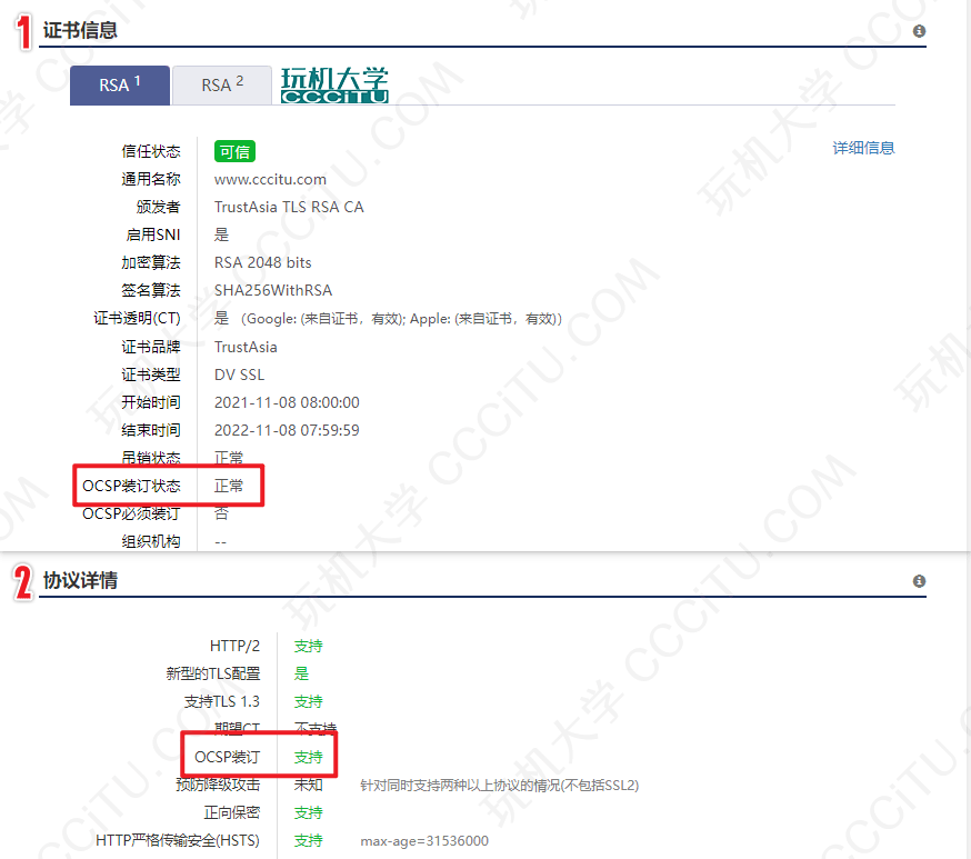 在证书信息和协议详情两部分,可以看到都显示 OCSP 装订支持,说明 OCSP 装订功能开启成功。