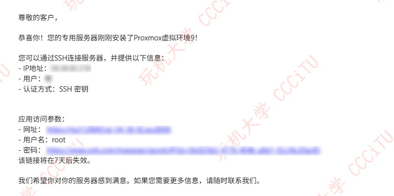 进入帐号注册所用邮箱,查看 Proxmox VE 登录信息:网址、用户名和密码(点击邮箱中的链接查看密码)